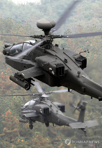 資料圖片:正在進(jìn)行訓練的駐韓美軍的阿帕奇直升機(韓聯(lián)社)