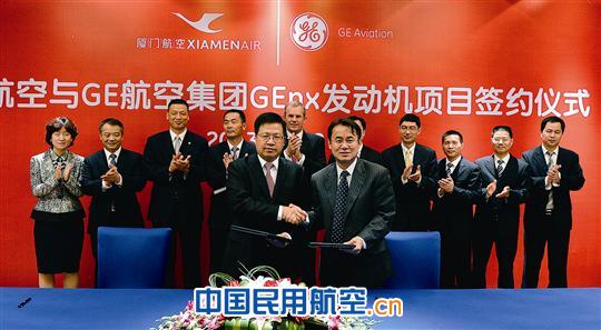 4月19日,廈航與美國GE公司在廈門(mén)簽署 波音787發(fā)動(dòng)機采購意向書(shū),這標志著(zhù)雙方已在B787發(fā)動(dòng)機選型項目中的重要商務(wù)和技術(shù)條款達成一致,是 廈門(mén)航空B787機隊選擇使用GEnx發(fā)動(dòng)機的一個(gè)鄭重承諾。