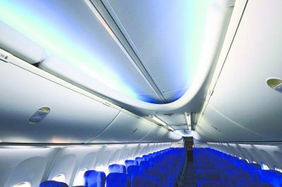 “這架飛機內飾有很大不同,燈光不再是刺眼白色,有白天、夜晚模式,十分柔和!”蔡治洲說(shuō),采用天花板凹形LED燈光照明,根據登機、起飛、用餐、休息等不同飛行階段或服務(wù)階段,選擇不同的燈光顏色和明暗度模式。在夜間飛行時(shí),客艙燈光光線(xiàn)由亮變暗,襯托藍色背椅,如同在藍色海洋,十分溫馨。行李架改為下拉式的,更易打開(kāi)。