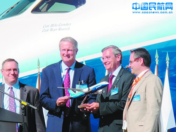 去年8月26日,波音獲頒波音787型號生產(chǎn)認證證書(shū)后,安波杰(左二)向歐洲安全局局長(cháng)(右二)贈送波音787模型。 (劉樹(shù)國/攝)
