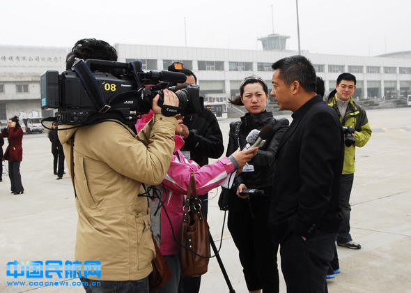 大連航空副總經(jīng)理陳自強向媒體記者談新飛機的飛行感受。(彭平/攝)