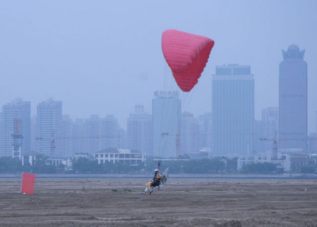 在?谑腥f(wàn)綠園后觀(guān)海臺賽點(diǎn),動(dòng)力懸掛滑翔機整裝待發(fā)