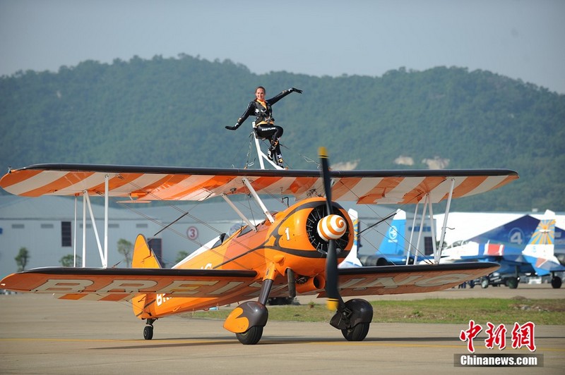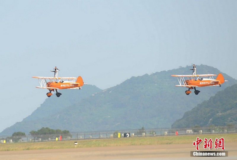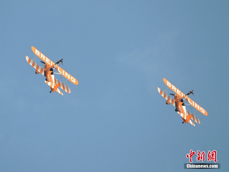 11月11日下午,歐洲“百年靈”機翼行走飛行表演隊表演了精彩的“云中漫步”。兩架飛機上各站有一名美女,在空中表演獨門(mén)舞步和雜技,隨飛機一起“云中漫步”,優(yōu)雅精準!