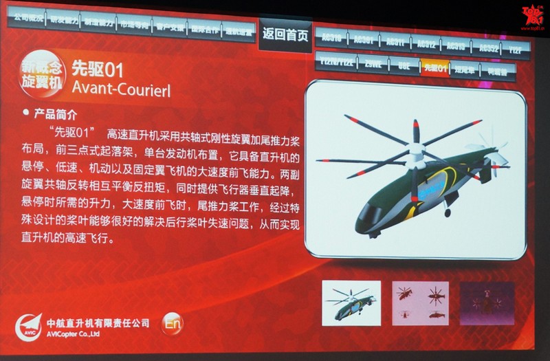 人民網(wǎng)北京11月9日電 (記者 楊鐵虎)中航工業(yè)直升機公司將在第九屆中國航展上展出“先驅01”新概念高速直升機模型。9日下午,中航工業(yè)直升機公司的專(zhuān)家向人民網(wǎng)記者介紹說(shuō),“先驅 01”新概念高速直升機采用共軸式剛性旋翼加尾推力槳布局,前三點(diǎn)式起落架,單臺發(fā)動(dòng)機布置。具備直升機的懸停、低速、機動(dòng)以及固定翼飛機的大速度前飛能力。