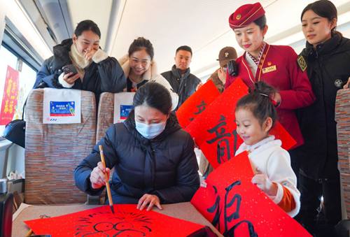 津興城際G8844次列車(chē)上,旅客現場(chǎng)手寫(xiě)書(shū)法福字、畫(huà)龍頭。(中國鐵路北京局集團有限公司供圖)