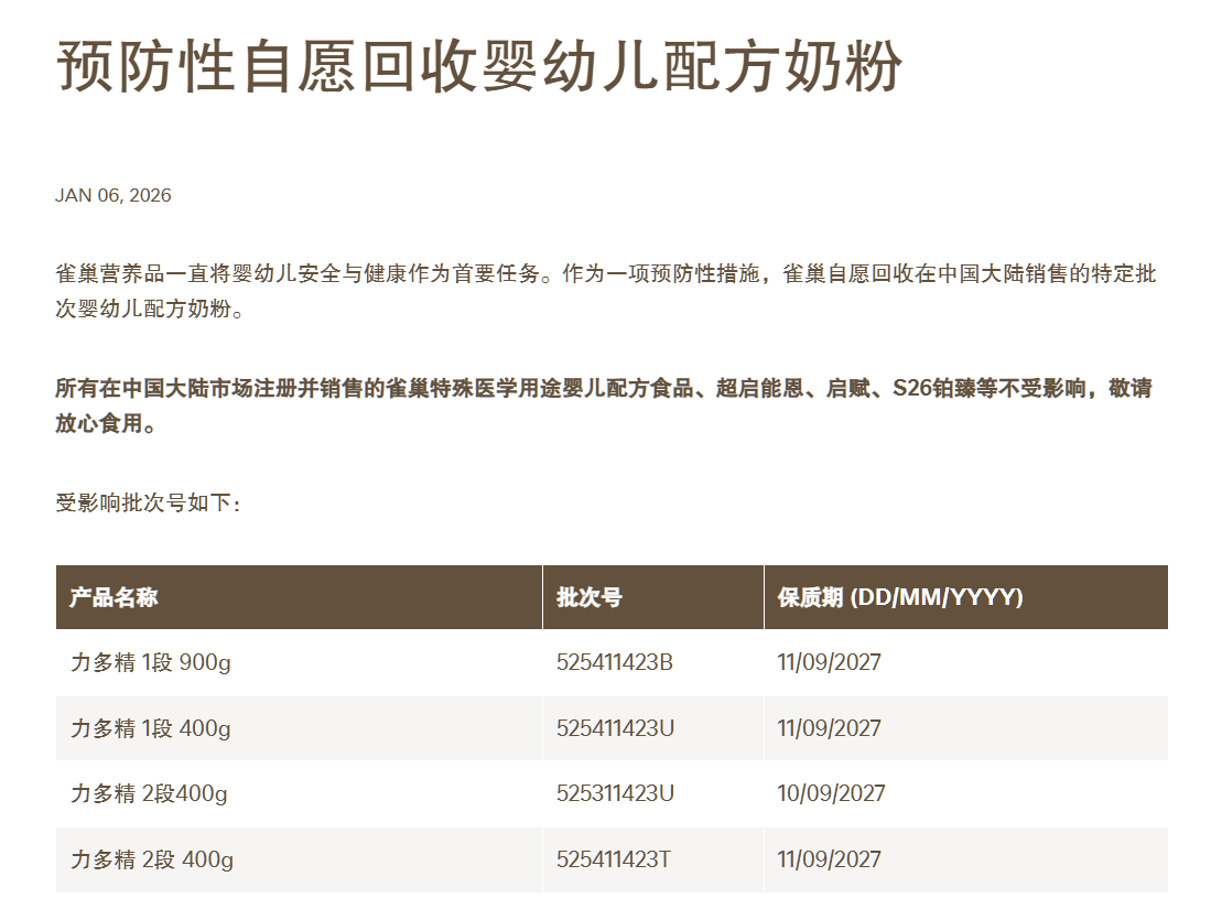 1月6日,雀巢大中華區官方網(wǎng)站發(fā)布兩則《預防性自愿回收嬰幼兒配方奶粉》公告。一份公告針對在中國大陸銷(xiāo)售的特定批次嬰幼兒配方奶粉,涉及力多精、鉑初能恩、舒宜能恩以及惠氏膳兒加兒童成長(cháng)奶粉等30批次產(chǎn)品。另一份公告則針對所有此次涉事的進(jìn)口自歐洲、在中國大陸跨境電商渠道銷(xiāo)售的嬰幼兒配方奶粉,涉及“Nestlé BEBA Supreme”“惠氏Wyeth啟賦未來(lái)”等41批次產(chǎn)品。