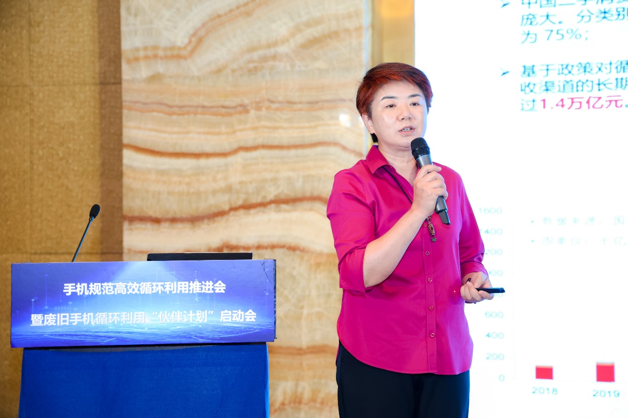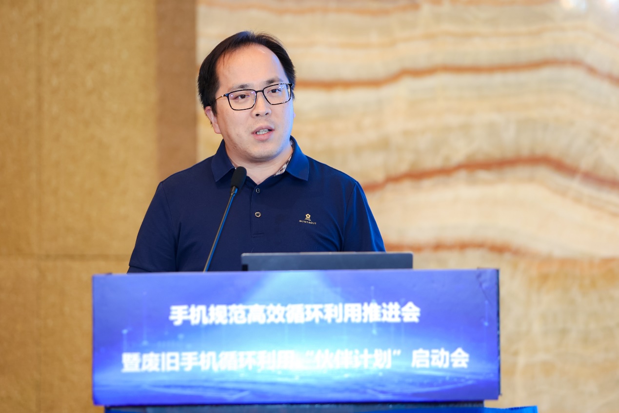 中國循環(huán)經(jīng)濟協(xié)會(huì )互聯(lián)網(wǎng)+資源循環(huán)利用專(zhuān)委會(huì )秘書(shū)長(cháng)侯允在會(huì )上發(fā)布廢舊手機循環(huán)利用團體標準框架。(主辦方供圖)