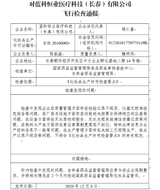 針對檢查中發(fā)現的問(wèn)題,國家藥監局要求吉林省藥品監督管理局應責令該企業(yè)限期整改,并將相關(guān)情況在2個(gè)月內報送國家藥品監督管理局化妝品監管司。