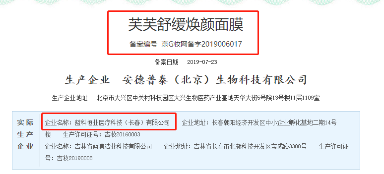 記者了解到,藍科恒業(yè)醫療科技(長(cháng)春)有限公司是芙芙舒緩煥顏面膜、芙芙深澈潤顏面膜、芙芙抑痘凈顏面膜、芙芙清痘復顏面膜等產(chǎn)品的生產(chǎn)企業(yè)。其中芙芙舒緩煥顏面膜在網(wǎng)購平臺上芙芙官方旗艦店總銷(xiāo)售量達54萬(wàn)。