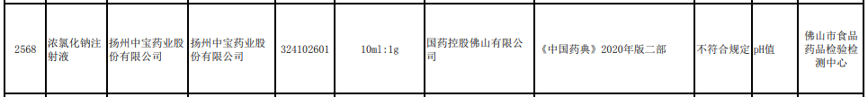 通告顯示,經(jīng)佛山市食品藥品檢驗檢測中心檢驗,揚州中寶藥業(yè)股份有限公司生產(chǎn)的濃氯化鈉注射液(批號:324102601)不符合規定,不合格項目為PH值。