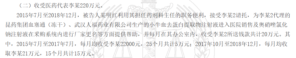 根據判決書(shū),20157月至201812月,被告人某明紅利用其擔任藥劑科主任的職務(wù)便利,接受“李某2”請托,為“李某2”代理的昆藥集團血塞通(凍干)、武漢人福藥業(yè)有限公司生產(chǎn)的小牛血去蛋白提取物注射液進(jìn)入醫院銷(xiāo)售及奧硝唑氯化鈉注射液在釆購系統內進(jìn)行廠(chǎng)家更名等方面提供幫助,并每月在其辦公室內,收受“李某2”所送錢(qián)款共計20萬(wàn)元。