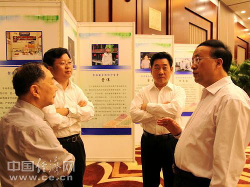 2013年全國食品安全宣傳周啟動(dòng)儀式暨第五屆中國食品安全論壇6月17日在北京舉辦,今年主題為“社會(huì )共治 同心攜手維護食品安全”。圖為論壇嘉賓中國工程院院士陳君石(左一)、國家食品藥品監督管理總局副局長(cháng)滕佳材(左二)、國家食品藥品監督管理總局副局長(cháng)劉佩智(右二)、蘭州市市長(cháng)袁占亭(右一)進(jìn)行交流。 中國經(jīng)濟網(wǎng) 王耀峰/攝