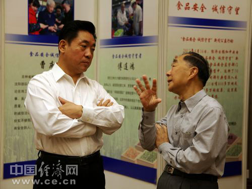 2013年全國食品安全宣傳周啟動(dòng)儀式暨第五屆中國食品安全論壇6月17日在北京舉辦,今年主題為“社會(huì )共治 同心攜手維護食品安全”。圖為食品藥品監管總局副局長(cháng)劉佩智(左)和中國工程院院士陳君石參觀(guān)食品安全“誠信守望者”展覽。中國經(jīng)濟網(wǎng) 王耀峰/攝